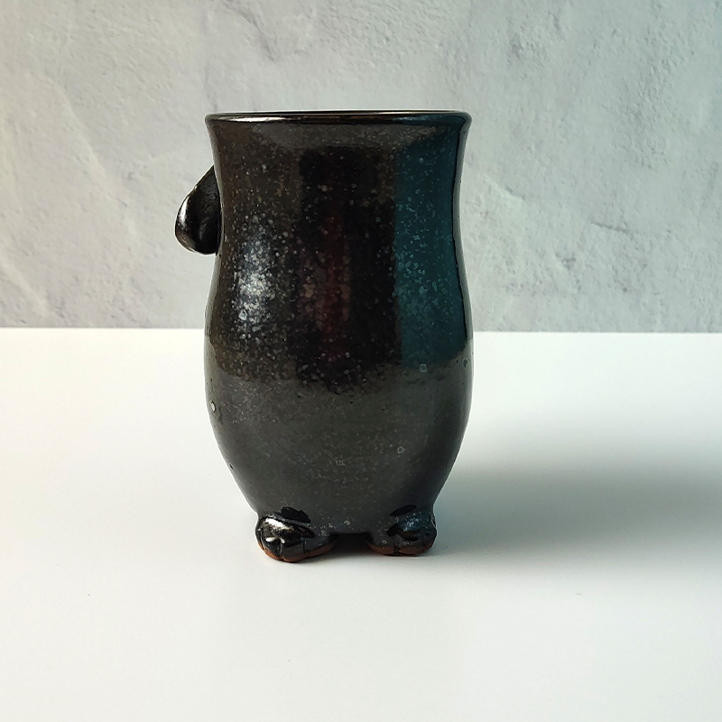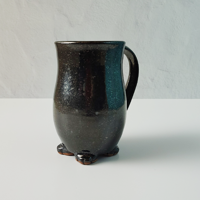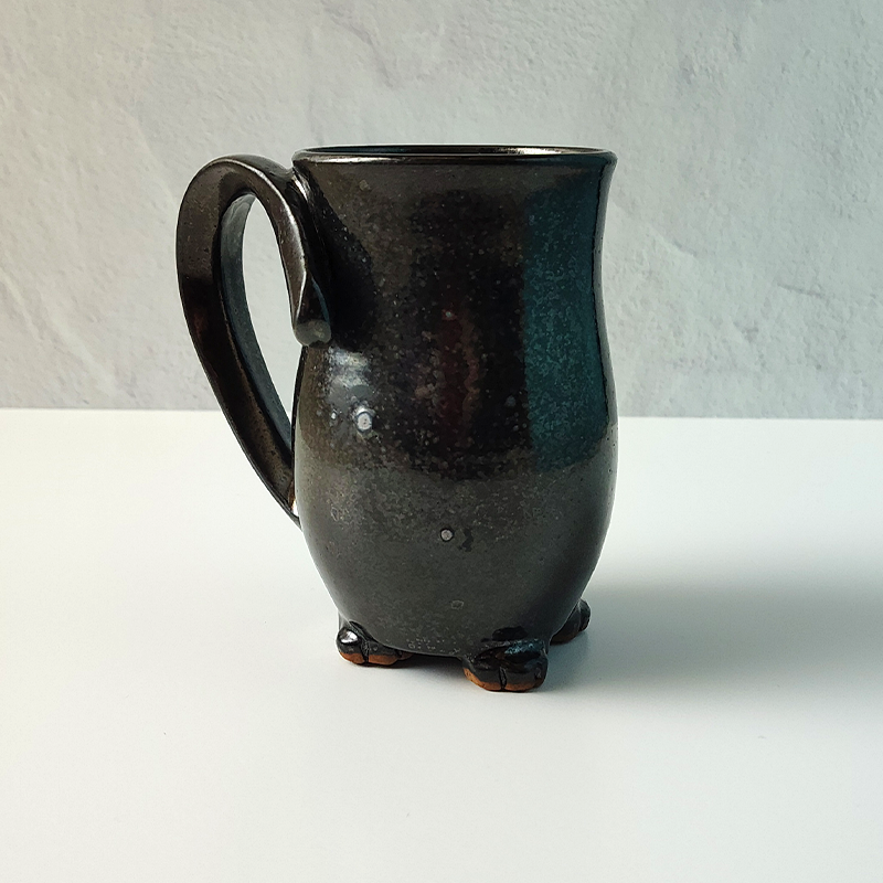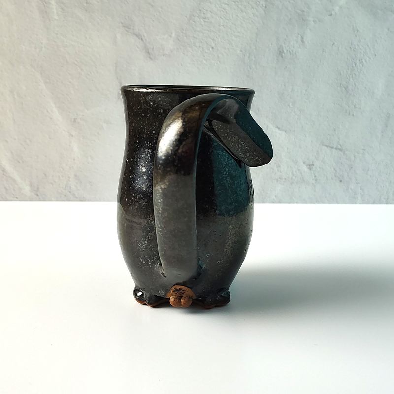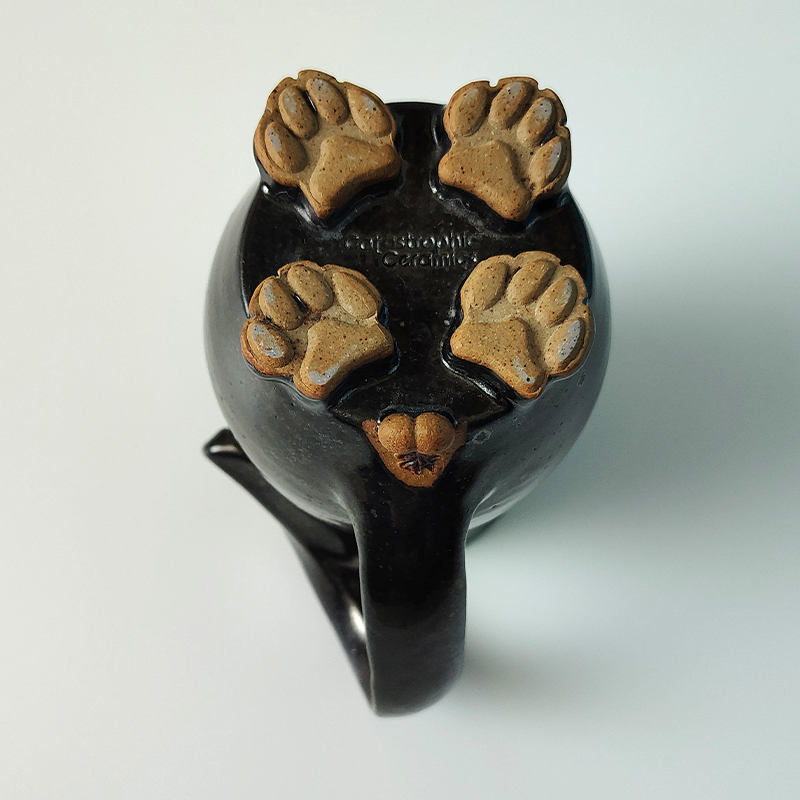 Footed mug sporting twisted tail inspired by the most fabulous of felines. This Cat Butt Mug has "trouble puffs" along with the normal tail details. The matte black glaze has a slight metallic sheen to it.