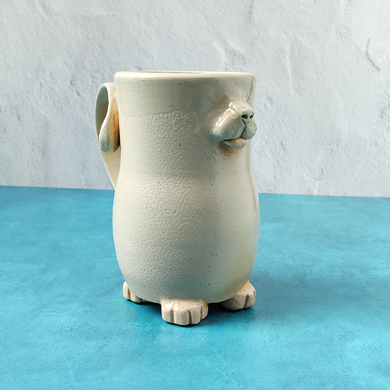 This boy Cat Butt Mug sports a sweet little nose and mouth, with a mostly white coat with a hint of soft ginger across his back and sides. Soda firing adds beautiful texture and variation. Full of charm; and yes, he has trouble puffs.