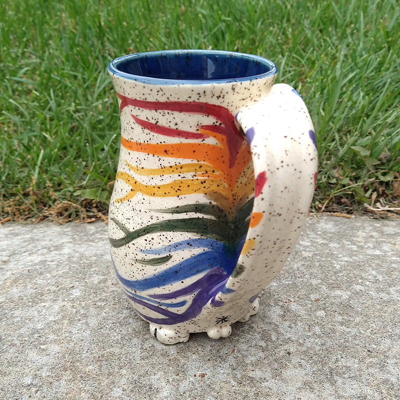 This fabulous feline is here to brighten your shelf and your mood with hand-painted rainbow stripes that pop against speckled clay. Whether you're starting your day or powering through it, this mug brings a bold splash of joy to every sip.